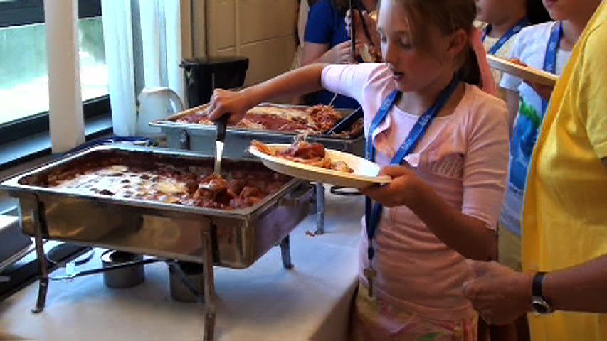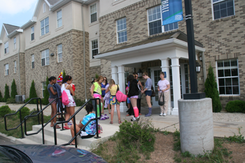 Each dorm room houses two campers. Two other campers in an adjoining room share a modern, double-sink bathroom with shower and tub. The dorm has a common recreation area and campus dorm staff is on duty at all times.